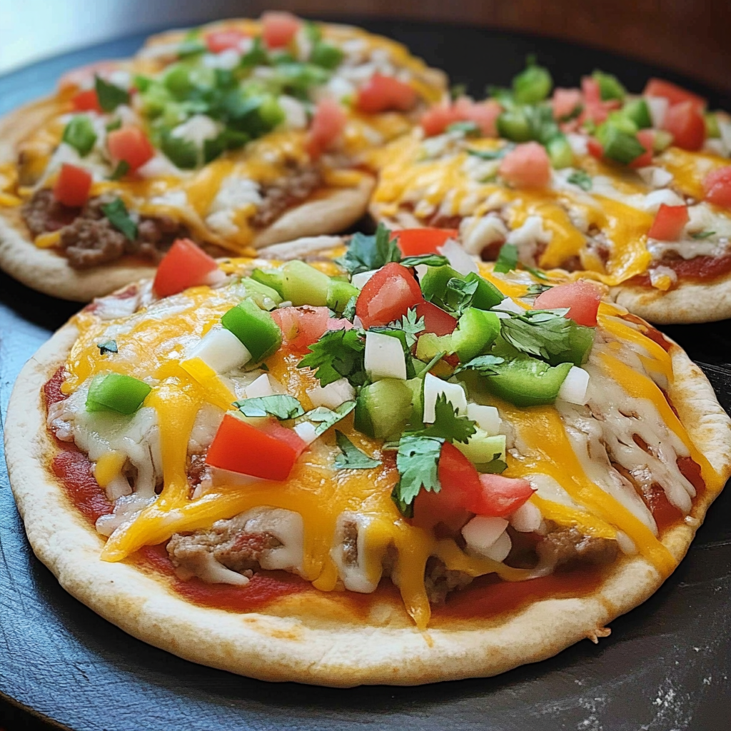 Preheat your oven to 400 degrees F and place your assembled pizzas on a baking sheet. Bake them for about 10 minutes until everything is heated through and the cheese is melted and bubbly. Just before serving, top with fresh diced tomatoes and chopped green onions for an extra pop of color and flavor. Enjoy every bite!